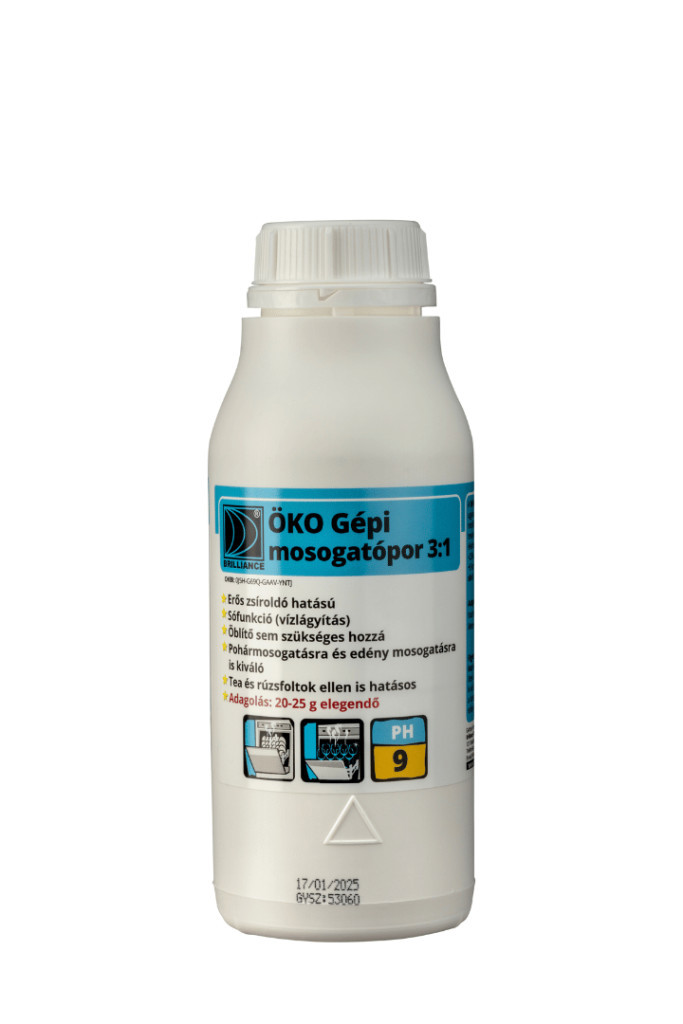 A Brilliance® ÖKO Gépi mosogatópor 3 az 1 erős zsíroldó hatással, só-funkcióval (vízlágyító hatással) rendelkezik, ugyanakkor nem szükséges hozzá öblítő sem. Nagyon hatékonyan megtisztítja az INOX felületeket megszünteti azok elszíneződését is. Hatékonyan küzd meg a tea, illetve rúzsfoltokkal is. Az eszközök és poharak is kiválóan tiszták és cseppmentesek lesznek. Elveszi az edények és a mosogatógép kellemetlen szagát. Alkalmazható háztartási és üzemi konyhákban, élelmiszeriparban, vendéglátó egységekben és közintézményekben és közintézmények konyháiban egyaránt.