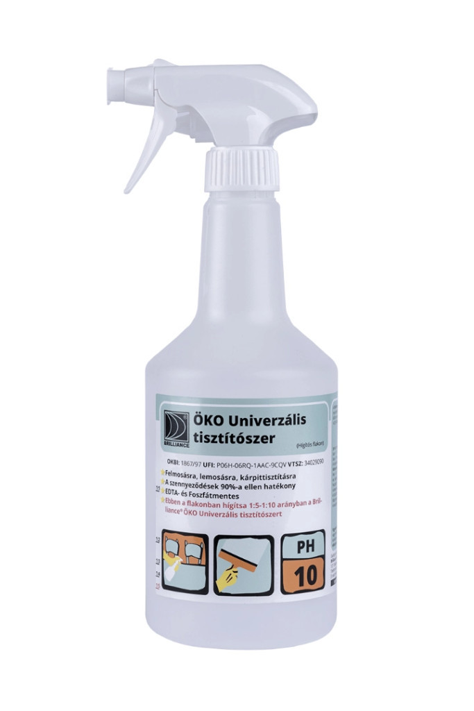 A Brilliance® ÖKO Univerzális tisztítószer magas hatóanyag tartalmú koncentrátum, amely a szennyeződések 90%-át eltávolítja. Az ipar és a háztartás számos területén hatékonyan alkalmazható, főként szilárd felületek lemosására. Rendkívüli hatékonyságával időt és energiát takaríthat meg, mivel tömény koncentrátum, ezért tárolása is egyszerű. Használat előtt felrázandó!