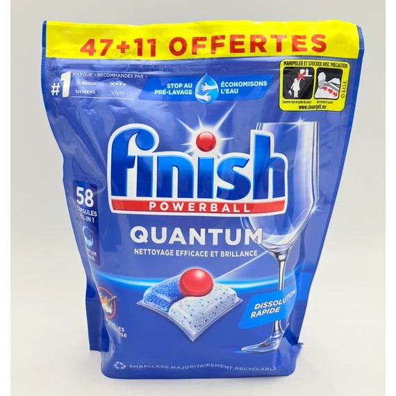 A Finish Quantum All in 1 mosogatógép tabletta 58 db Regular prémium minőségű, többfunkciós kapszula, amely hatékonyan távolítja el a makacs ételmaradékokat előöblítés nélkül is. Egyetlen tabletta tisztít, zsírtalanít és ragyogó fényt biztosít az edényeknek.