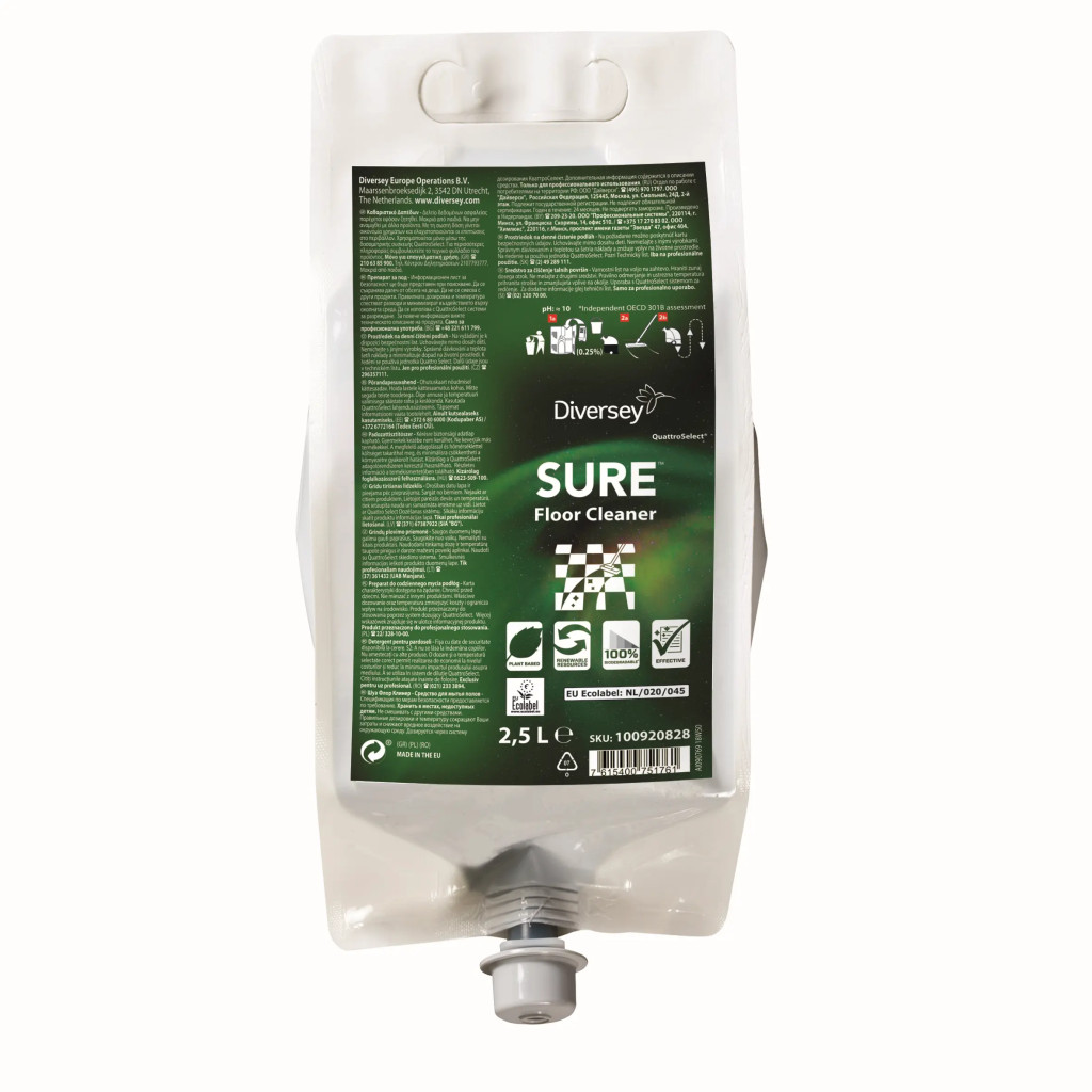 A SURE Floor Cleaner QS az egyedi SURE termékkör tagja, mely 100%-osan lebomló*, növényi alapú összetétellel rendelkező professzionális tisztítószereket kínál minden napi tisztítási feladat elvégzésére. A SURE Floor Cleaner egy fékezett habzású, koncentrált padozattisztító szer koncentrátum, mely minden vízálló padlófelület tisztítására alkalmas.