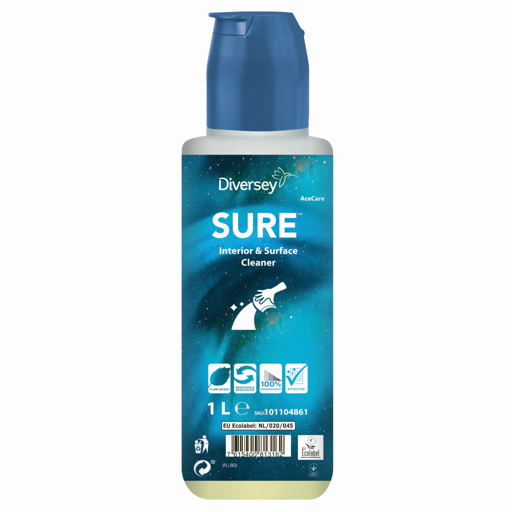 A SURE Interior & Surface Cleaner a növényi alapú, 100%-ban biológiailag lebomló professzionális tisztítószerek egyedülálló termékcsaládjának része, a mindennapi takarítási követelményekhez igazodva. A SURE Interior & Surface Cleaner egy koncentrált univerzális tisztítószer kemény felületek tisztítására (élelmiszeripari helyiségekben is), és alkalmas padlókra, falakra, ajtókra, mennyezetekre és mindenféle berendezésre.