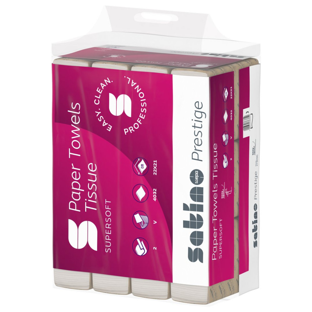 - Satino Wepa Prestige V hajtogatott kéztörlő 2 rétegű, fehér, 22x21cm, 4032 lap/zsák