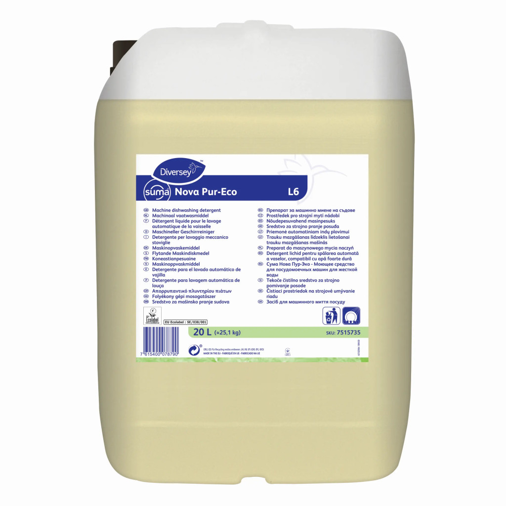 A Suma Nova Pur-Eco L6 egy koncentrált folyékony gépi mosogatószer, amely kiválóan eltávolítja a szennyeződést kemény víz estén is.