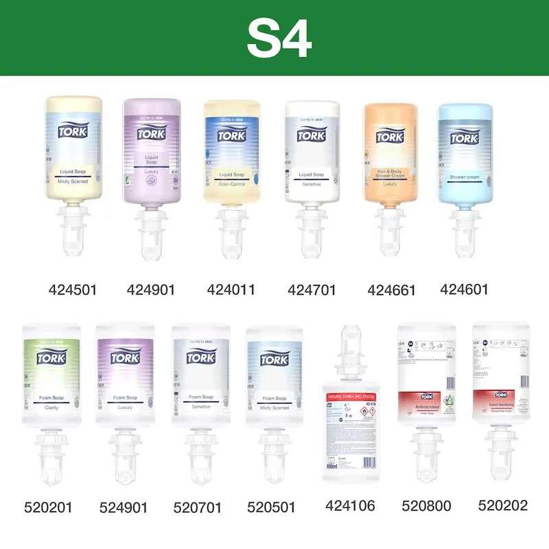 A rendszer kompatibilis a Tork S4 utántöltőkkel, beleértve a habszappanokat, kézfertőtlenítőket és kézápolókat. Az adagoló állítható dózismennyiséggel rendelkezik, így optimalizálható a fogyasztás és a higiéniai hatékonyság. A gyárilag zárt, új pumpával ellátott flakonok használatával csökken a keresztfertőzés kockázata, miközben a töltés gyors és egyszerű – mindössze 10 másodperc alatt elvégezhető.