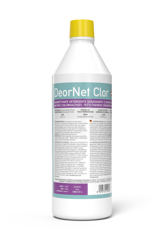 A DEORNET CLOR egy klóros PMC fertőtlenítőszer. Padlók és burkolatok, szaniterek, csaptelepek, acélfelületek, WC-k és öltözők tisztítására használható. Az erős tisztítóerő teljes tisztítási és fertőtlenítési eljárást tesz lehetővé, így a felületek mentesek a kellemetlen szagoktól. Baktericid, mikobaktericid/tuberkulocid, fungicid, sporicid, virucid hatású. Hatékony különféle baktériumok és élesztőgombák, köztük a Candida Auris ellen.