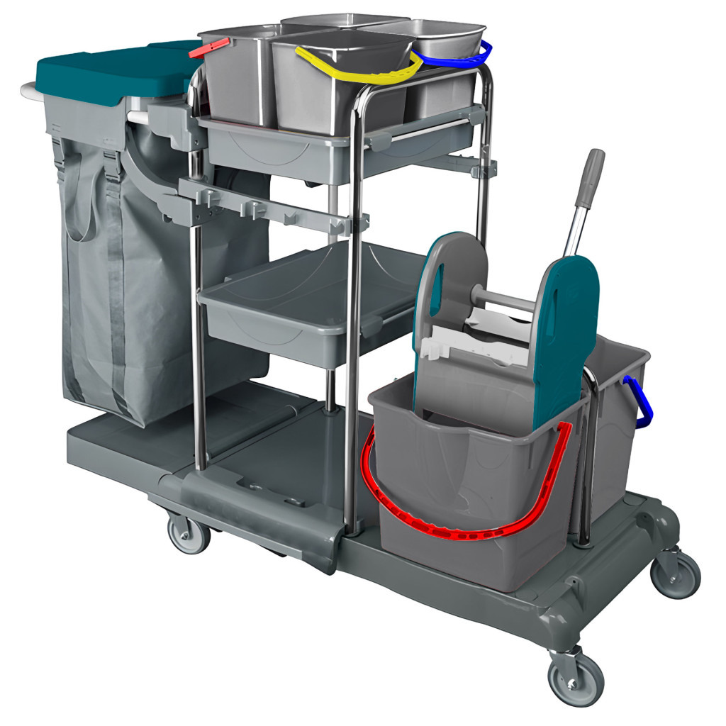 Ez a takarítókocsi szintén kombinált szerkezetű, műanyag és krómozott acél elemekből áll, amely stabilitást és tartósságot biztosít. Két 18 literes vödörrel van felszerelve, amelyekkel hatékonyan elkülöníthetők a tiszta és szennyezett folyadékok. A kialakítás egyszerű, praktikus, a könnyen gördülő kerekek pedig segítik a mozgathatóságot.