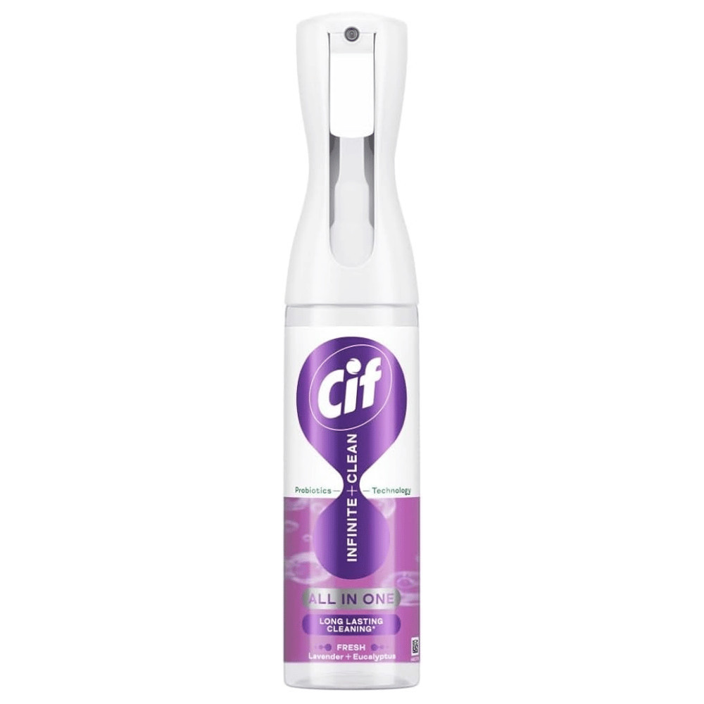 A CIF Infinite+Clean All in One tisztítóspray, multisurface, azaz többféle felületen alkalmazható: konyhai munkalapok, csempék, tükrök, üvegfelületek, csaptelepek, de akár könyvespolc, elektronikai eszköz burkolata is. Innovatív „probiotikum technológiával” rendelkezik, ami azt jelenti, hogy az egyszeri használat után a termék hatása még napokig (akár 3 napig) is folytatódhat a kemény felületeken.